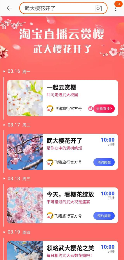 淘寶手機APP搜索“武大櫻花開了”,進入直播間觀看