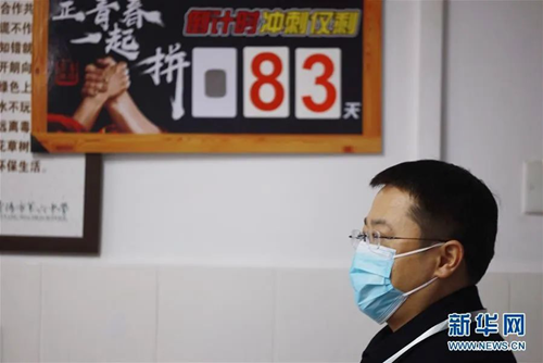 貴陽(yáng)市第六中學(xué)一名高三任課老師在高考倒計(jì)時(shí)83天的指示牌前。