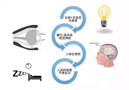 人眼視網膜上存在第三類感光細胞-內在光敏性視網膜神經節細胞(intrinsicallyphotosensitive reTInal ganglion cells (ipRGCs)),負責調節機體視覺以外的非視覺效應,如管理時間的功能,協調和控制人們在不同時段里的活動節律和幅度。