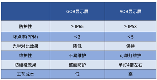 對于室內使用的LED顯示模塊,這樣的解決方案通過將外露的電性傳導引腳包覆的方式,有效防止因水氣潮濕、灰塵所帶來的失效故障點等問題的發生,同時可以提供防護磕碰的效果,目前市場上的表面覆膜解決方案有GOB顯示屏、AOB顯示屏等等,表1是和一般SMD顯示屏的比較。