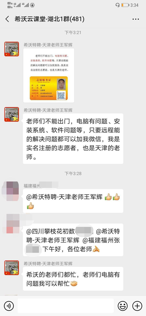王軍輝老師不僅僅關(guān)心自身學(xué)校的答疑情況,還自愿加入湖北云課堂答疑微信群,幫助湖北老師熟練使用希沃白板云課堂功能,在這個特殊時期為湖北的老師們雪中送炭,成為教育戰(zhàn)線上的“最美逆行者”。