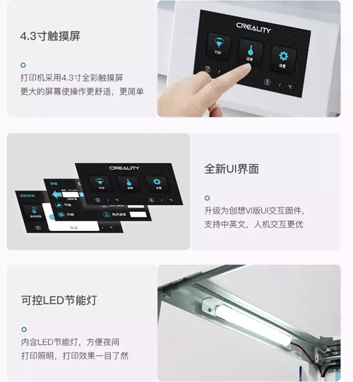 除以上功能外:研發團隊對觸摸屏的尺寸進行了升級,4.3寸大屏幕更方便操作。全新UI界面讓整個指令更清晰。可控的LED節能燈讓3D打印將不受時間和地點的限制,隨時查看打印進度。