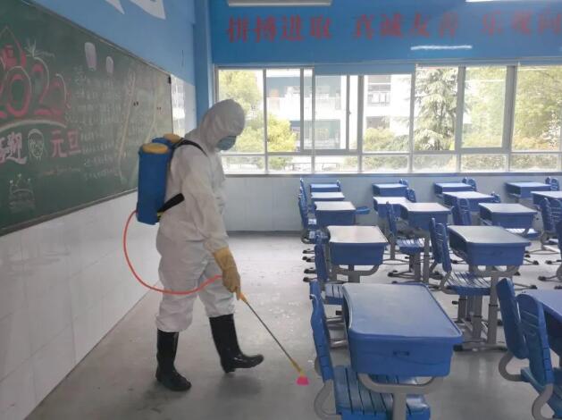 圖為五十中學天鵝湖教育集團天鵝湖校區工作人員教室消殺