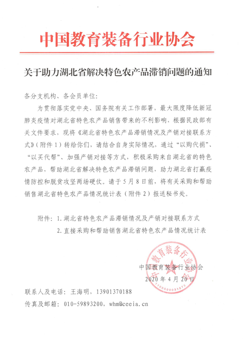 中國教育裝備行業協會關于助力湖北省解決特色農產品滯銷問題的通知