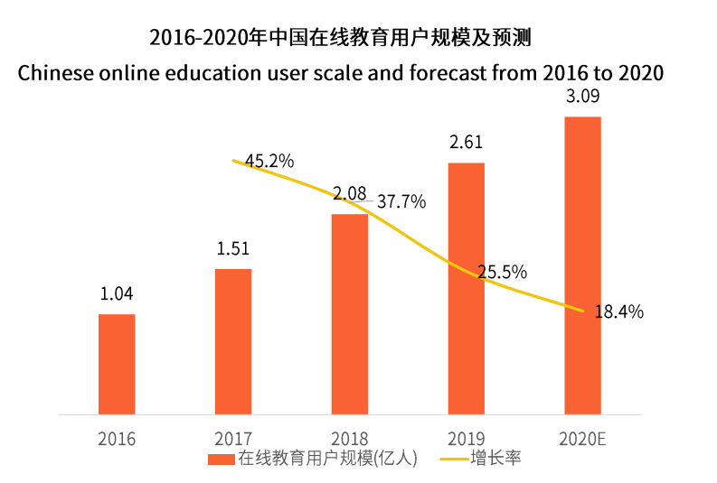 據數據分析機構艾媒咨詢發布的《2019-2020年中國K12在線教育行業研究報告》顯示,中國在線教育用戶規模正在以近20%的年增率一路狂奔,預計2020年中國在線教育用戶規模將達3.09億人,其中基礎教育在線教育用戶規模將達3765.6萬人。