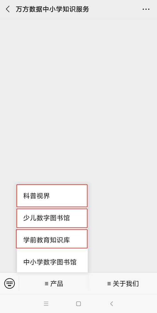 在“萬方數據中小學知識服務”界面,點擊左下角“產品”,可以顯示出我們免費提供的三款產品入口(如上圖)
