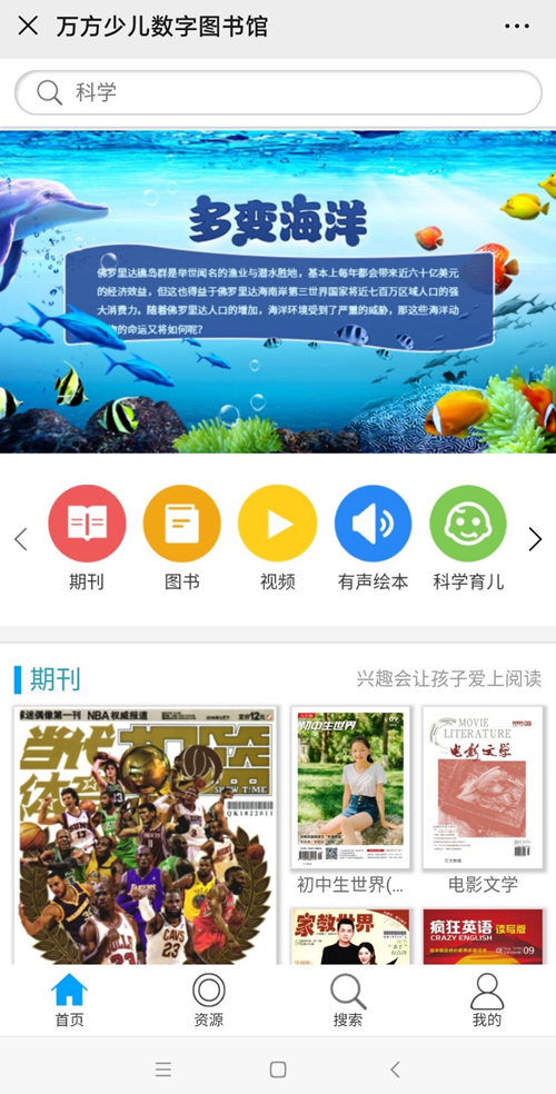 資源包括:優質的科普視頻資源、精美的有聲繪本、各類豐富的期刊文獻、圖書、視頻。暢游知識海洋,定會收獲多多!