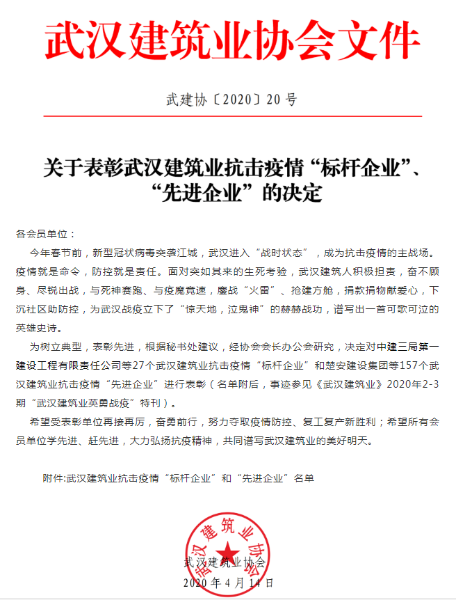 近日,武建協【2020】20號文件發布了《關于表彰武漢建筑業抗擊疫情“標桿企業”“先進企業”的決定》, itc在抗擊疫情中勇于擔當、逆向而行,積極履行社會責任,表現突出,被評為“武漢建筑業抗擊疫情先進企業”!