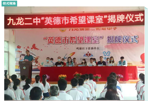碧桂情系鄉(xiāng)山,科技助力教育。5月7日,英德市九龍鎮(zhèn)第二初級中學(xué)隆重舉行了碧桂園集團&國強基金會&云蝶科技全額捐贈的首批“希望教室”揭牌儀式,共同助力英德信息化教育建設(shè)。碧桂園·國強公益基金會英德片區(qū)營銷總經(jīng)理陳虹穎、英德項目部經(jīng)理鄧志鵬、黃利紅;云蝶科技營銷副總裁沈勇;清遠市教育局基信科科長馮志恒;英德市教育局局長張燕輝等領(lǐng)導(dǎo)受邀出席。九龍二中全體教師、九年級學(xué)生代表共一百余人一同見證了此次愛與希望的滿滿匯聚。