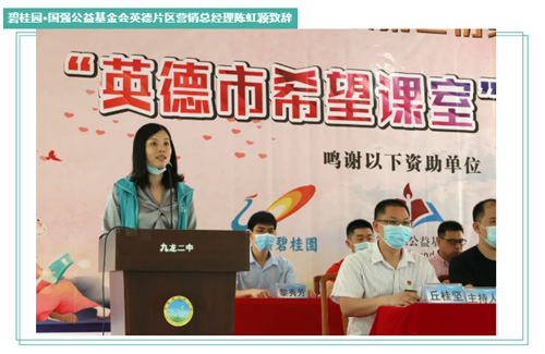 接著碧桂園·國強公益基金會英德片區(qū)營銷總經(jīng)理陳虹穎致辭,她表示碧桂園•國強公益基金將繼續(xù)不忘慈善初心,牢記習(xí)總書記的囑托,熱心公益,捐資助學(xué),講仁愛、行善事、播愛心。她還強調(diào),青年是祖國的未來和希望,國強公益基金會將繼續(xù)利用科技來推動鄉(xiāng)村教育,為鄉(xiāng)村教育提供更多的資源,為鄉(xiāng)村學(xué)生拓寬眼界。