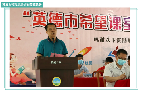 隨后英德市教育局局長張燕輝發(fā)表致辭。張局長首先感謝碧桂園•國強公益基金會和云蝶科技對英德教育事業(yè)的大力支持,對“希望教室”項目順利竣工并交付使用表示熱烈的祝賀。接著,張局長在致辭中指出,碧桂園•國強公益基金會和云蝶科技真誠地為英德教育事業(yè)獻愛心做實事,對英德教育的發(fā)展作出了巨大的貢獻,讓更多的農(nóng)村學(xué)校從中受益,碧桂園•國強公益基金會和云蝶科技的善心義舉讓人敬佩。