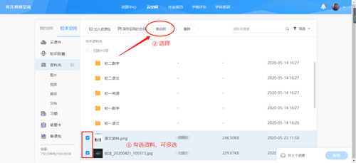 接下來,咱們就可以將文件歸類了~操作非常簡單,勾選對應的資料,例如可以選擇所有語文學科的資料,然后點擊“移動到”,就可以放到原先創建好的文件夾了。