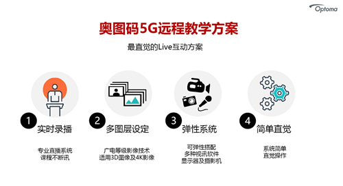 奧圖碼5G遠程教學方案具有使用方法簡單、操作界面直觀的特點,是為一套憑直覺就可進行師生實時互動的方案。其特色包括:
