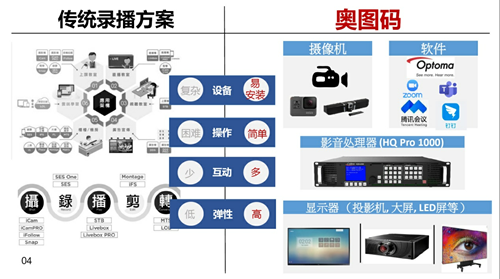 傳統錄直播教學解決方案類似傳統廣電演播室,包含攝、錄、剪、轉、播幾大塊,由大量的傳統硬件組成,系統復雜。
