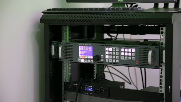 解決方案體驗中心分直錄播A教室和學生端B教室,推開A教室大門,與最初想象的大相徑庭,原本印象中傳統的直錄播間,應該是數臺大型、復雜的機器和設備,大型中控臺,各種視頻、聲音采集設備,監控大屏,機柜,各種線材,總之傳統的錄播間給人一種凌亂復雜的感受。與此相比,奧圖碼直錄播教室完全給人煥然一新的感覺——簡單、有序、智能;綠幕背景,一臺攝像機,一臺HQ Pro1000(奧圖碼核心技術影音處理器),兩臺大屏顯示器,對,就這么簡單,少而精。