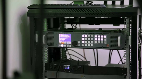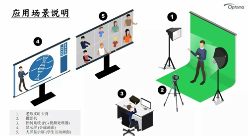 在使用這套系統(tǒng)時(shí),教師一個(gè)人就能完成授課過(guò)程:教師在綠幕棚進(jìn)行錄像,影像將會(huì)被傳輸?shù)綂W圖碼HQ Pro 1000影音處理器中,處理器會(huì)將課程需要的的背景畫面、PPT簡(jiǎn)報(bào)、3D畫面甚至AR影像與教師講課的身影融合,呈現(xiàn)出更加的沉浸的教學(xué)效果,然后實(shí)時(shí)將畫面?zhèn)鬟f到學(xué)生的屏幕上。