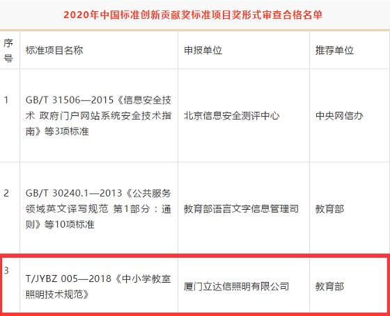 教育部推薦、國家市場監(jiān)管總局評選!立達信提出并起草的教育照明標準入選2020年中國標準創(chuàng)新貢獻獎形式審查合格名單!