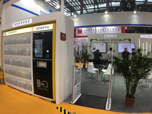 智慧借閱體驗區吸引了眾多觀展者的駐足,現場展示了微型圖書館、自助借還書機以及安全門。