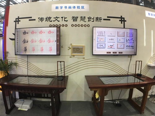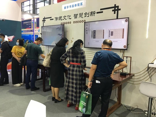 現場的數字書畫體驗區及5G&VR體驗區吸引了眾多觀展者駐足體驗。書法臺利用毛筆三維空間力檢測技術,以水代墨,以屏代紙,為大家提供了數字仿真書寫體驗。