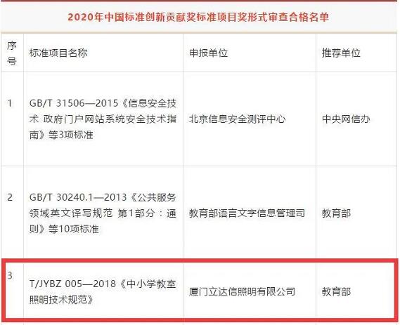 《中小學(xué)教室照明技術(shù)規(guī)范》標(biāo)準(zhǔn)歸口單位為中國(guó)教育裝備行業(yè)協(xié)會(huì),由立達(dá)信提出并牽頭起草。標(biāo)準(zhǔn)自2018年5月1號(hào)實(shí)施以來(lái),取得了良好的社會(huì)反響,獲得多項(xiàng)榮譽(yù):入選工業(yè)和信息化部2019年標(biāo)準(zhǔn)應(yīng)用示范項(xiàng)目名單,今年更獲教育部推薦、經(jīng)國(guó)家市場(chǎng)監(jiān)管總局評(píng)選入選2020年中國(guó)標(biāo)準(zhǔn)創(chuàng)新貢獻(xiàn)獎(jiǎng)形式審查合格名單。