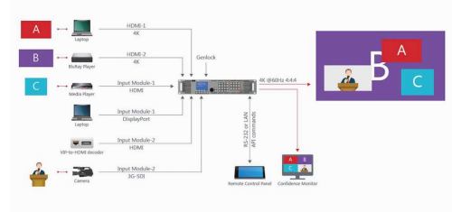 它具有超低延時,以單像素為基準,精確調節,模組化設,支持4K 50/60HZ 4:4:4影像輸出。同時還具有四圖層畫面,各圖層可任意切換大小位置,額外還擁有一個靜態背景圖層,真正無縫切換和漸進漸出。
