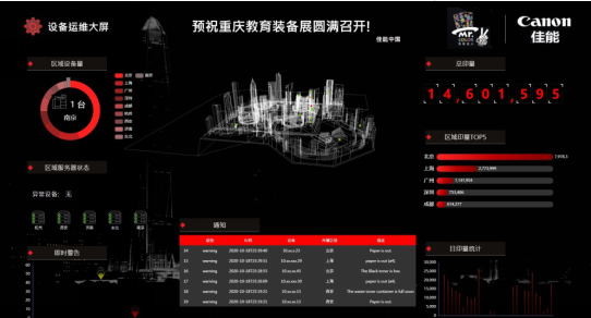 在此次展會(huì)中, 佳能不僅展示了與朋友圈伙伴們的豐富合作,同時(shí)還帶來(lái)了兩款針對(duì)逐漸普及的教育文印租賃服務(wù)的打印設(shè)備管理解決方案。首次展出的數(shù)據(jù)大屏(標(biāo)準(zhǔn)版),能通過(guò)網(wǎng)絡(luò)實(shí)時(shí)監(jiān)測(cè)全國(guó)范圍內(nèi)的佳能復(fù)合機(jī)設(shè)備,設(shè)備狀態(tài)、墨粉狀態(tài)、紙盒狀態(tài)、印量和費(fèi)用成本等都一覽無(wú)余。另外一款佳能新研發(fā)的打印機(jī)遠(yuǎn)程監(jiān)控管理解決方案,可以免費(fèi)提供給企業(yè)IT使用,無(wú)需部署和安裝,就能實(shí)現(xiàn)打印設(shè)備的遠(yuǎn)程監(jiān)控和管理。