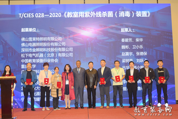 中國照明學(xué)會專職副理事長華樹明、中國教育裝備行業(yè)協(xié)會副秘書長朱俊英、重慶照明學(xué)會理事長楊春宇共同發(fā)布了中國照明學(xué)會團體標(biāo)準(zhǔn)T/CIES 028—2020《教室用紫外線殺菌(消毒)裝置》,并為標(biāo)準(zhǔn)參編單位和專家頒發(fā)了證書。