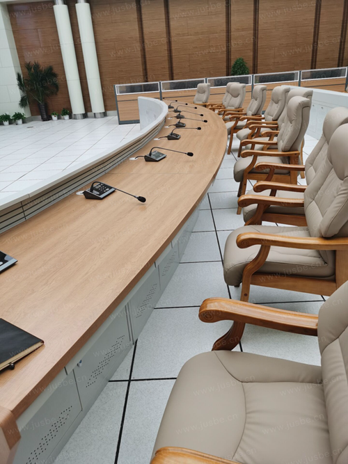 指揮中心主席臺,采用的手拉手會議系統,支持討論和視像跟蹤功能,具備多種會議模式選擇。系統可設置發言數量、自動/限時關閉、聲控發言等功能。會議系統討論單元采用防干擾電路設計,超指向電容話筒,實現高品質聲音拾取。話筒帶聲頻啟動功能,發言時話筒單元電源自動打開。其中,主席單元擁有優先發言權。