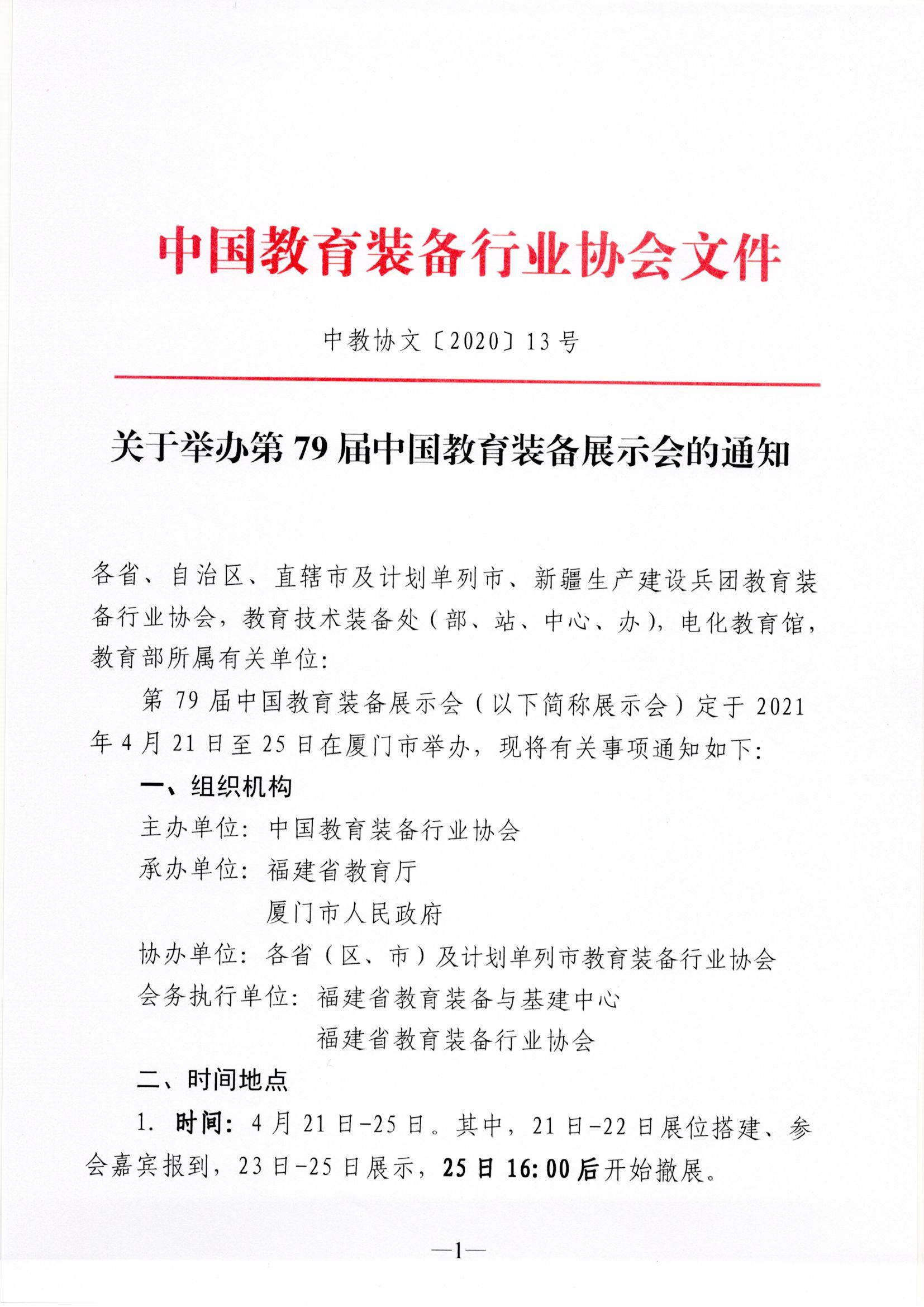 第79屆中國教育裝備展示會(以下簡稱展示會)定于2021年4月21日至25日在廈門市舉辦,現將有關事項通知如下: