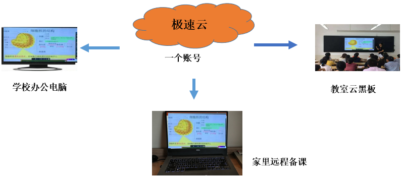 極速云不僅可以讓智慧黑板之間互連互通、協同教學,還可以將歐帝智慧黑板、辦公電腦、家用電腦相連。老師不再需要將筆記本或者U盤帶到教室授課,只需要一個賬號,即可接入云桌面,實現云教學、云備課。