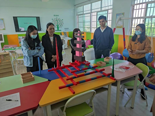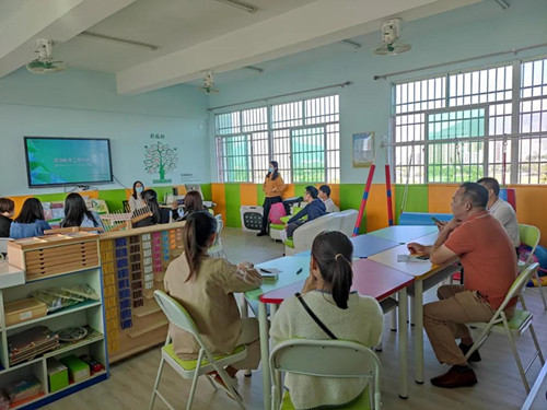 理論知識講完之后,培訓師主要帶領老師們進行產品的體驗操作,通過感統教具中的協力訓練板和獨角椅等教具進行體驗感受,使用蒙臺梭利教具粉紅塔、棕色梯、彩色圓柱等教具共同完成創作,讓老師們直觀的體驗學習教具的使用,在體驗現場也時不時傳來老師們歡聲笑語。培訓結束后,老師們紛紛表示本次培訓收獲很多,學到了很多相關知識。