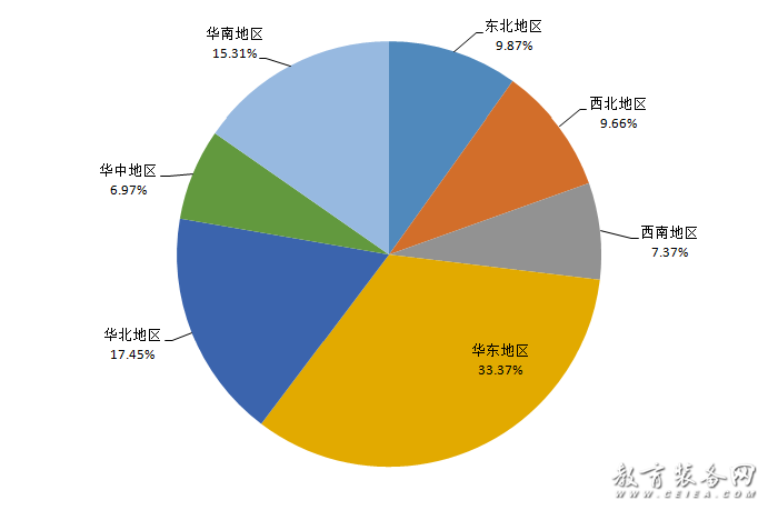 根據11月份收集到的教育裝備招標采購信息(見圖2、圖3):教育裝備招標采購區域信息數據共3272條(招標采購信息地區設置為單選項)。其中,華東地區招標采購信息量1092條,占區域信息量的33.37%;華北地區招標采購信息量571條,占區域信息量的17.45%;華南地區招標采購信息量501條,占區域信息量的15.31%;東北地區招標采購信息量323條,占區域信息量的9.87%;西北地區招標采購信息量316條,占區域信息量的9.66%;西南地區招標采購信息量241條,占區域信息量的7.37%;華中地區教育裝備招標采購信息量均為228條,占區域信息量的6.97%。