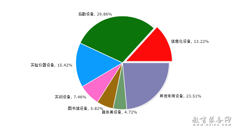 根據對教育裝備細分的歸納,教育裝備網將教育裝備具體劃分為七大類,即信息化設備(含智能平板、錄播系統、智慧黑板等),后勤設備(含校園基建、安防設備、食堂設備、課桌椅等),實驗儀器設備(含儀器儀表、實驗室平臺等),實訓設備(含實訓系統、實訓設施等),圖書館設備(含借還系統、微型圖書館等),音體美設備(含樂器、體育設施、美術用品等),其他專用設備(含創客教育、心理健康特教設備等)。