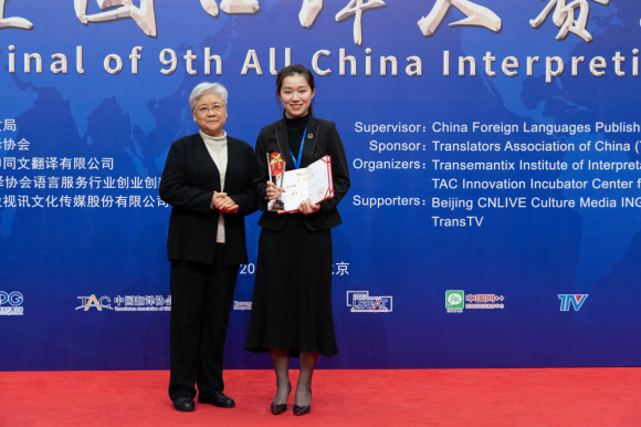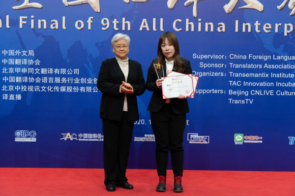 中國翻譯協會顧問唐聞生、朱英璜,常務理事徐亞男,當代中國與世界研究院副院長、中國翻譯協會副秘書長楊平等出席大賽總決賽閉幕式暨頒獎典禮并為獲獎選手和指導老師頒發獎杯、榮譽證書。