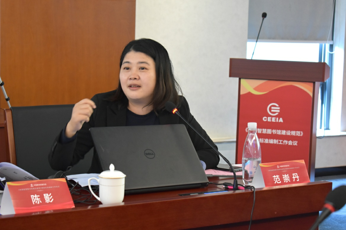 范崇丹代表《校園智慧圖書館建設規范》團體標準編制工作組,對該項團體標準的起草工作及標準框架進行了匯報。