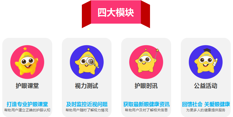 為了更好的深化科普效果,讓護眼科普從學(xué)校延伸到家庭,閃亮品牌專門研發(fā)線上護眼平臺“閃亮眼護理中心”小程序,其包含護眼課堂、視力測試、護眼時訊、公益活動等四大模塊,在線上通過科普+互動的形式,讓孩子和家長都能夠參與到護眼科普的互動中,這也是新時代科技護眼的創(chuàng)新體現(xiàn)。