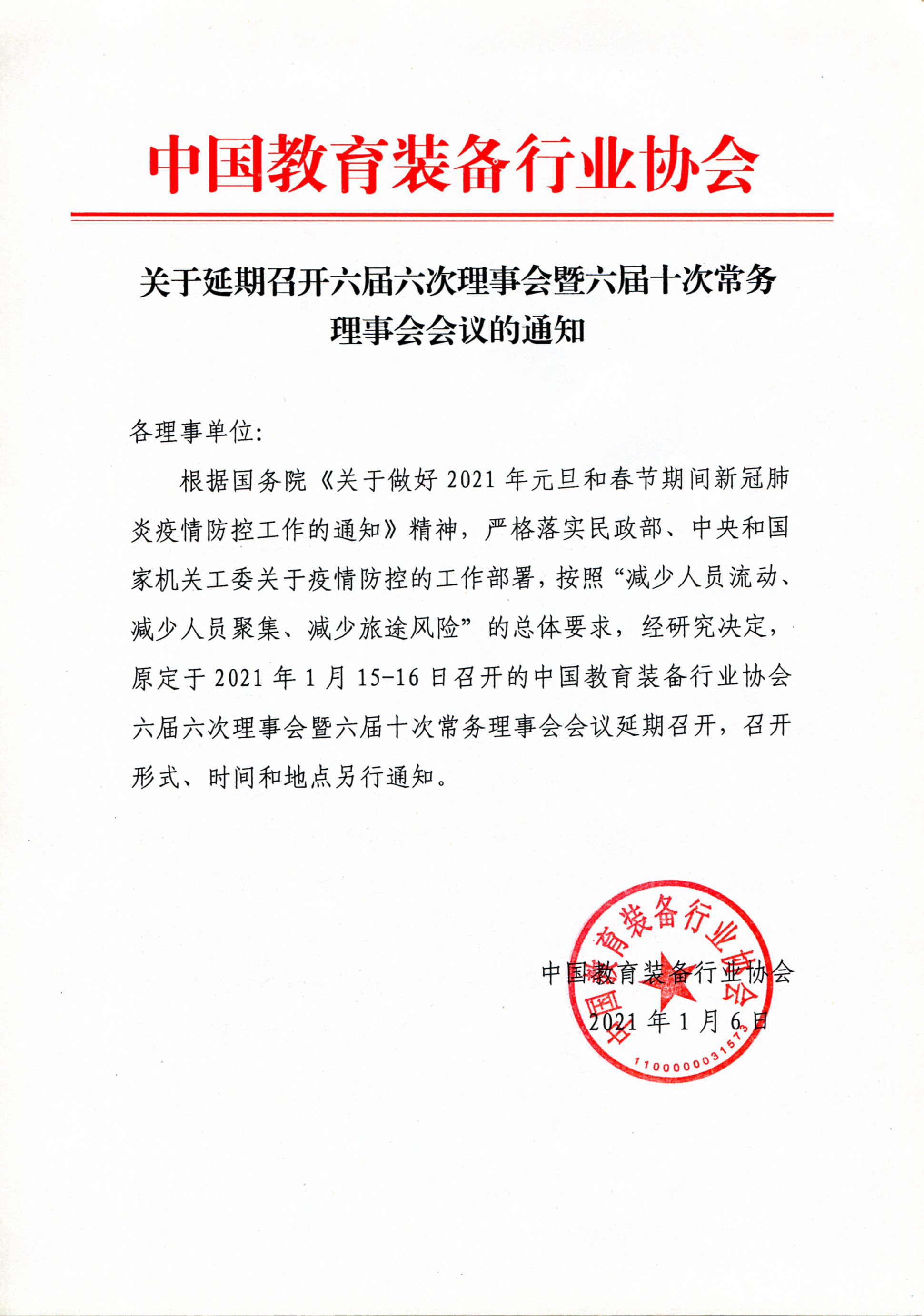 中國教育裝備行業(yè)協(xié)會(huì)關(guān)于延期召開六屆六次理事會(huì)暨六屆十次常務(wù)理事會(huì)會(huì)議的通知