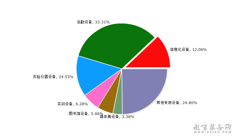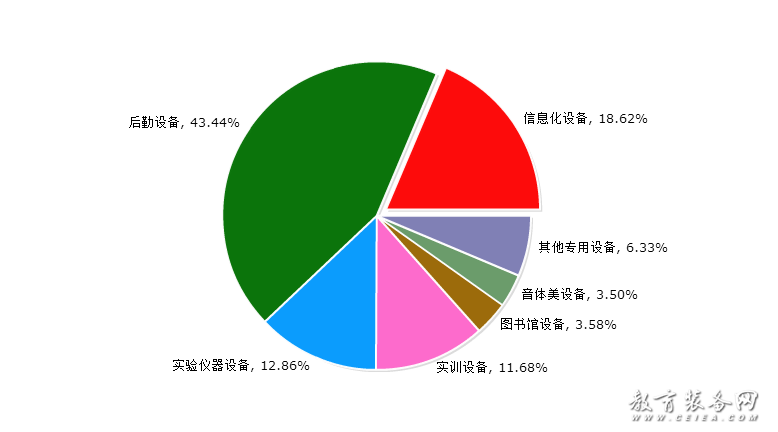 根據對教育裝備細分的歸納,教育裝備網將教育裝備具體劃分為七大類,即信息化設備(含智能平板、錄播系統、智慧黑板等),后勤設備(含校園基建、安防設備、食堂設備、課桌椅等),實驗儀器設備(含儀器儀表、實驗室平臺等),實訓設備(含實訓系統、實訓設施等),圖書館設備(含借還系統、微型圖書館等),音體美設備(含樂器、體育設施、美術用品等),其他專用設備(含創客教育、心理健康特教設備等)。