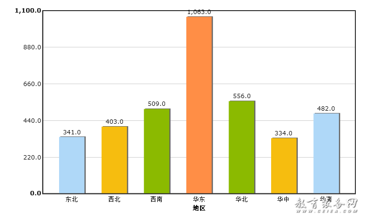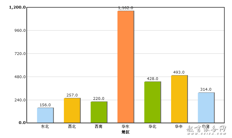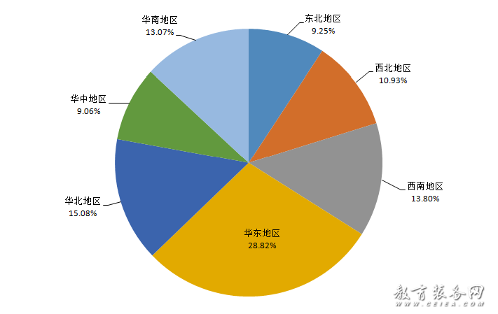 根據12月份收集到的教育裝備招標采購信息(見圖2、圖3):教育裝備招標采購區域信息數據共3688條(招標采購信息地區設置為單選項)。其中,華東地區招標采購信息量1063條,占區域信息量的28.82%;華北地區招標采購信息量556條,占區域信息量的15.08%;西南地區招標采購信息量509條,占區域信息量的13.80%;華南地區招標采購信息量482條,占區域信息量的13.07%;西北地區招標采購信息量403條,占區域信息量的10.93%;東北地區招標采購信息量341條,占區域信息量的9.25%;華中地區教育裝備招標采購信息量均為334條,占區域信息量的9.06%。