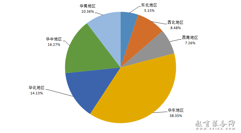 12月份教育裝備中標采購區域信息數據共3030條(中標信息區域設置為單選項)見圖6、圖7,華東地區中標信息量1162條,占區域信息量的38.35%;華中地區中標信息量493條,占區域信息量的16.27%;華北地區中標信息量428條,占區域信息量的14.13%;華南地區中標信息量314條,占區域信息量的10.36%;西北地區中標信息量257條,占區域信息量的8.48%;西南地區中標信息量220條,占區域信息量的7.26%;東北地區教育裝備中標信息量156條,占區域信息量的5.15%。