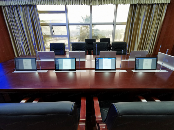 根據會議室布局,會議桌面安裝的無紙化一體升降端,采用1080P高清屏,屏幕觸控靈敏,書寫不晃。系統擁有豐富的會議功能,具備會議議程、簽到表決、文件上傳、資料閱讀、批注、同屏投影、白板互動、視頻播放、文檔加密、權限下載等,參會者只需手指觸控即可完成操作,整個會議過程高效又便捷。