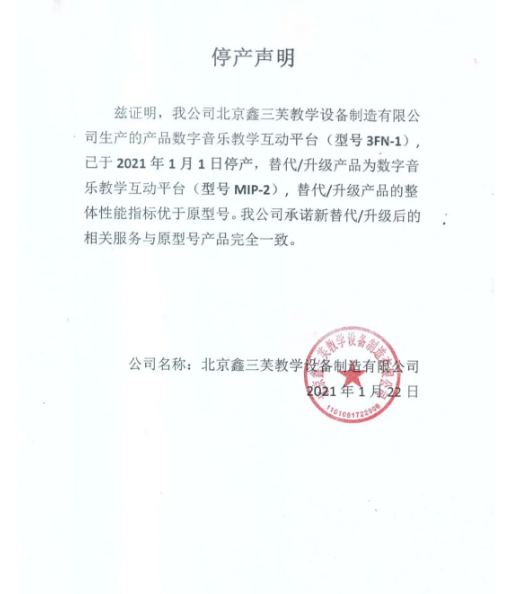 茲證明,我公司北京鑫三芙教學設備制造有限公司生產的產品數字音樂教學互動平臺(型號3FN-1),已于2021年1月1日停產,替代/升級產品為數字音樂教學互動平臺(型號MIP-2), 替代/升級產品的整體性能指標優于原型號。我公司承諾新替代/升級后的相關服務與原型號產品完全一致。