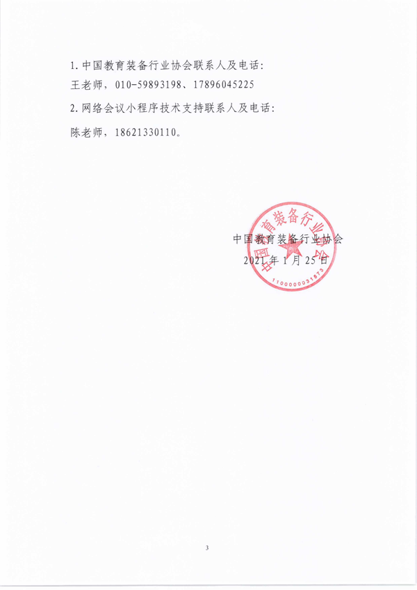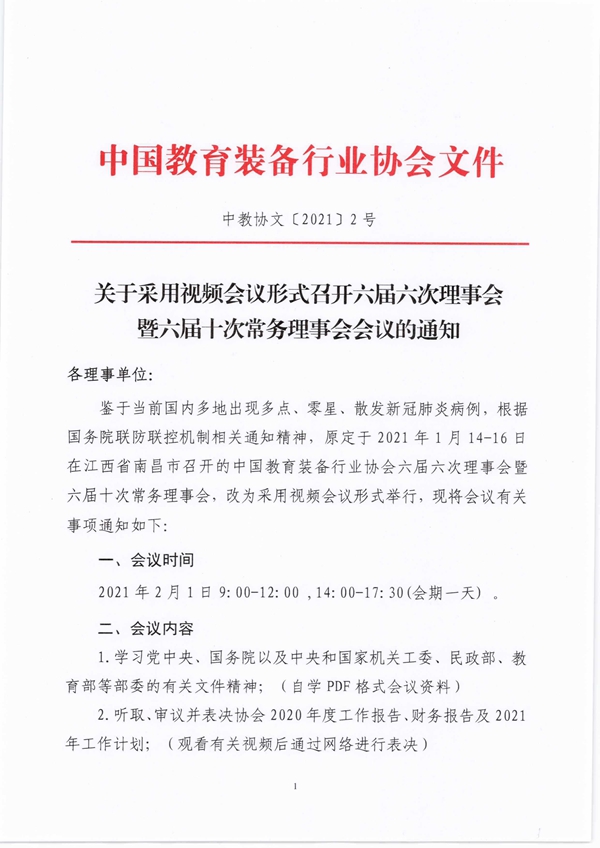 鑒于當前國內多地出現多點、零星、散發新冠肺炎病例,根據國務院聯防聯控機制相關通知精神,原定于2021年1月14-16日在江西省南昌市召開的中國教育裝備行業協會六屆六次理事會暨六屆十次常務理事會,改為采用視頻會議形式舉行,現將會議有關事項通知如下:
