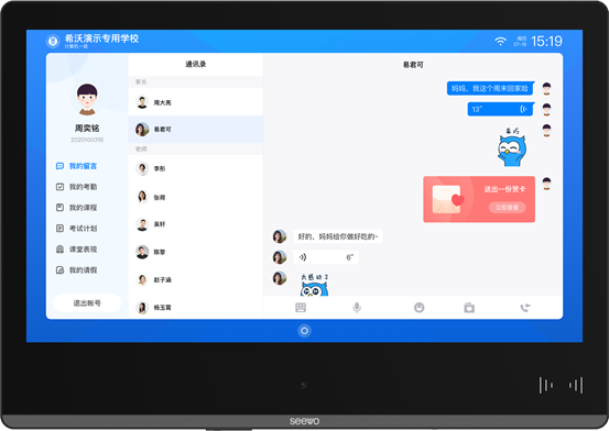 手機(jī)禁入校園后,家長(zhǎng)最擔(dān)心的就是無(wú)法及時(shí)與學(xué)生建立聯(lián)系,不了解孩子的在校情況。希沃云班牌的NFC刷卡識(shí)別和人臉識(shí)別功能,讓學(xué)生以刷卡或刷臉的方式快速登錄個(gè)人賬號(hào),通過(guò)班牌實(shí)時(shí)向家長(zhǎng)發(fā)送留言,留言形式豐富,包括文字、語(yǔ)音、表情包等。家長(zhǎng)也可以通過(guò)手機(jī)直接發(fā)送留言給孩子,孩子可以在課間刷卡閱讀和回復(fù)。