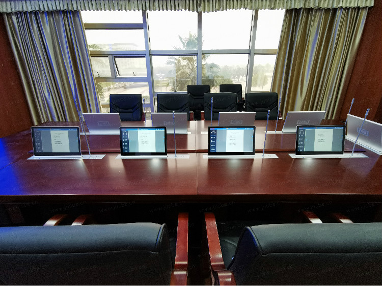 根據(jù)會(huì)議室布局,會(huì)議桌面安裝的無紙化一體升降端,采用1080P高清屏,屏幕觸控靈敏,書寫不晃。系統(tǒng)擁有豐富的會(huì)議功能,具備會(huì)議議程、簽到表決、文件上傳、資料閱讀、批注、同屏投影、白板互動(dòng)、視頻播放、文檔加密、權(quán)限下載等,參會(huì)者只需手指觸控即可完成操作,整個(gè)會(huì)議過程高效又便捷。