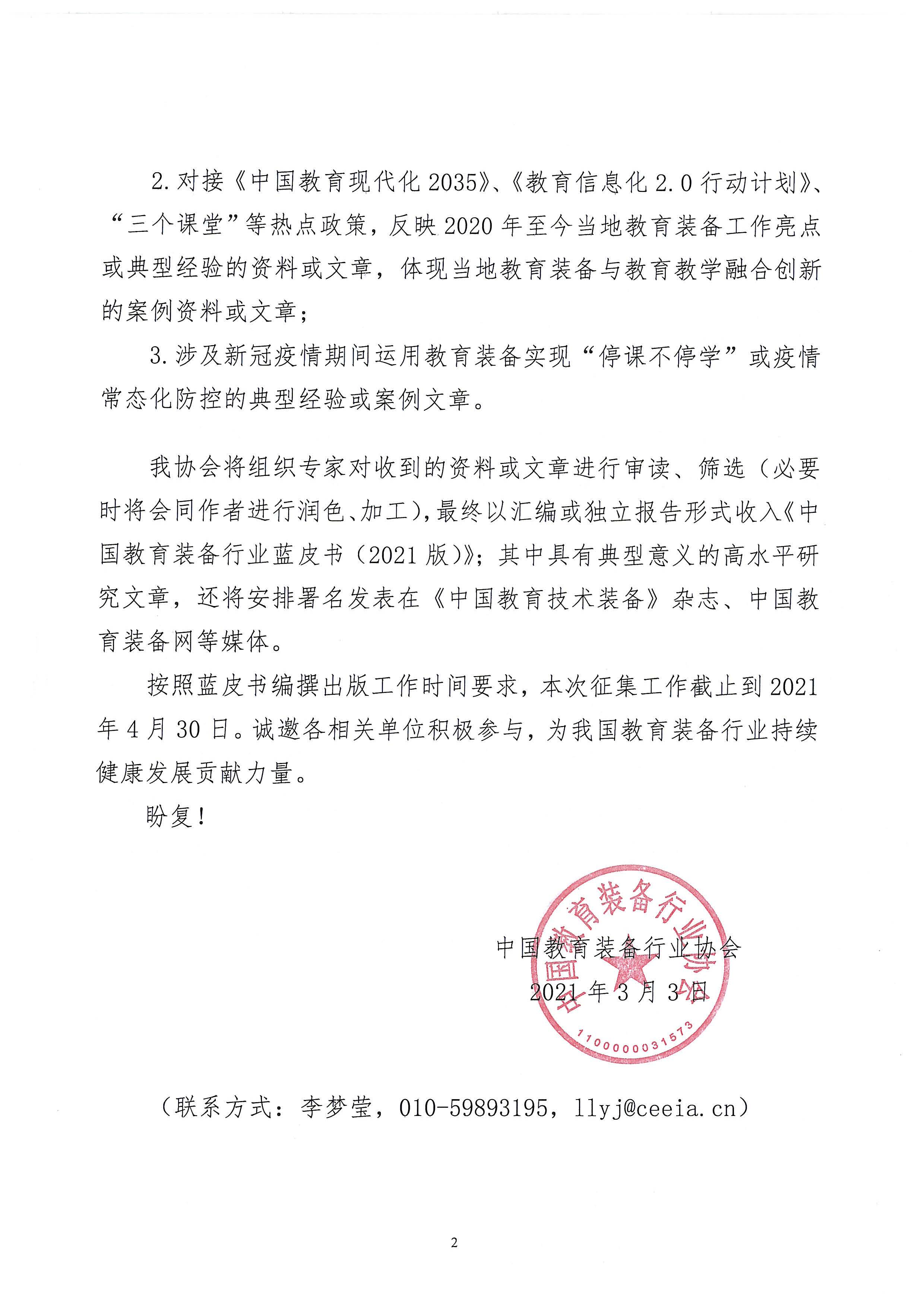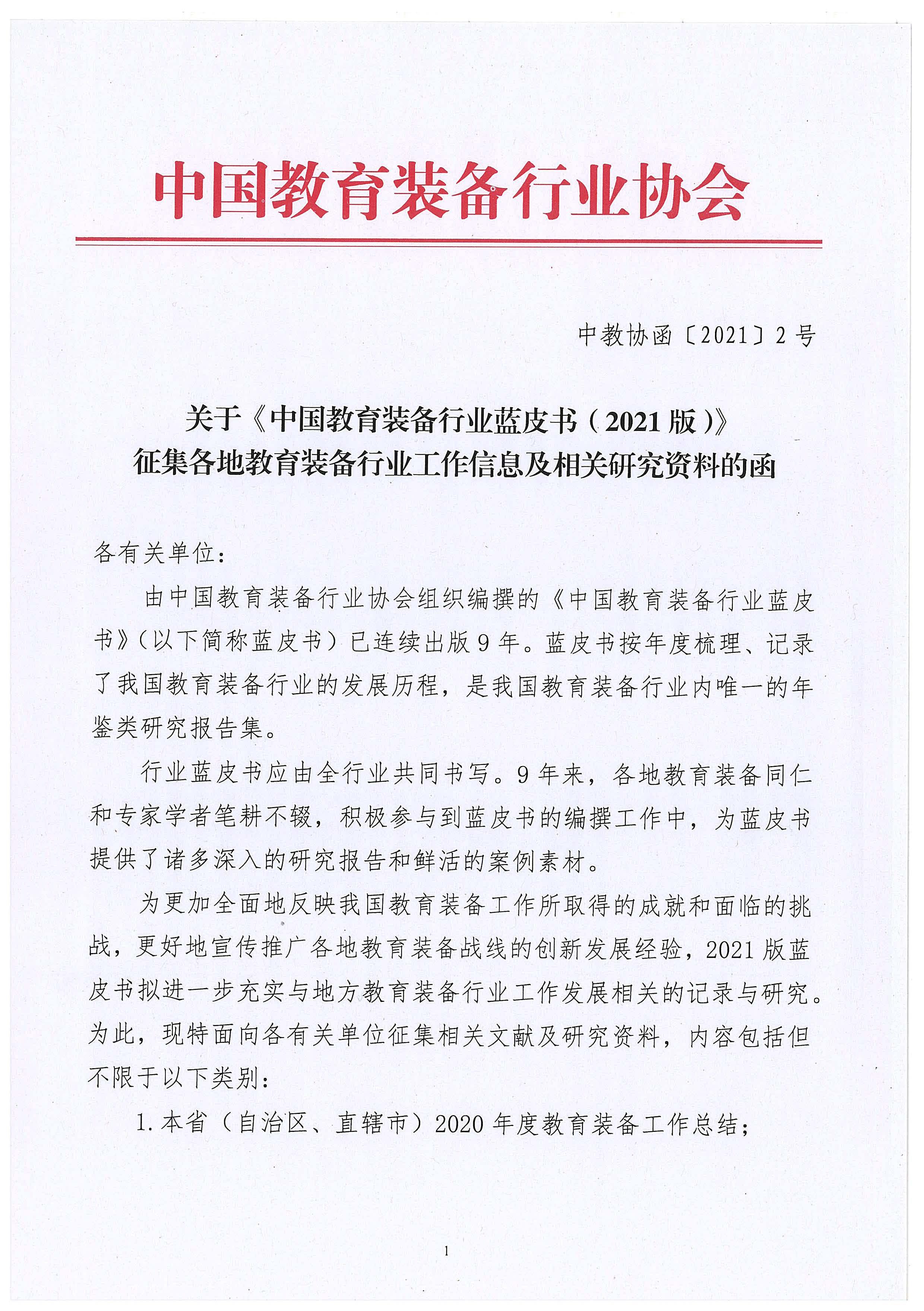 關(guān)于《中國教育裝備行業(yè)藍(lán)皮書(2021版)》征集各地教育裝備行業(yè)工作信息及相關(guān)研究資料的函