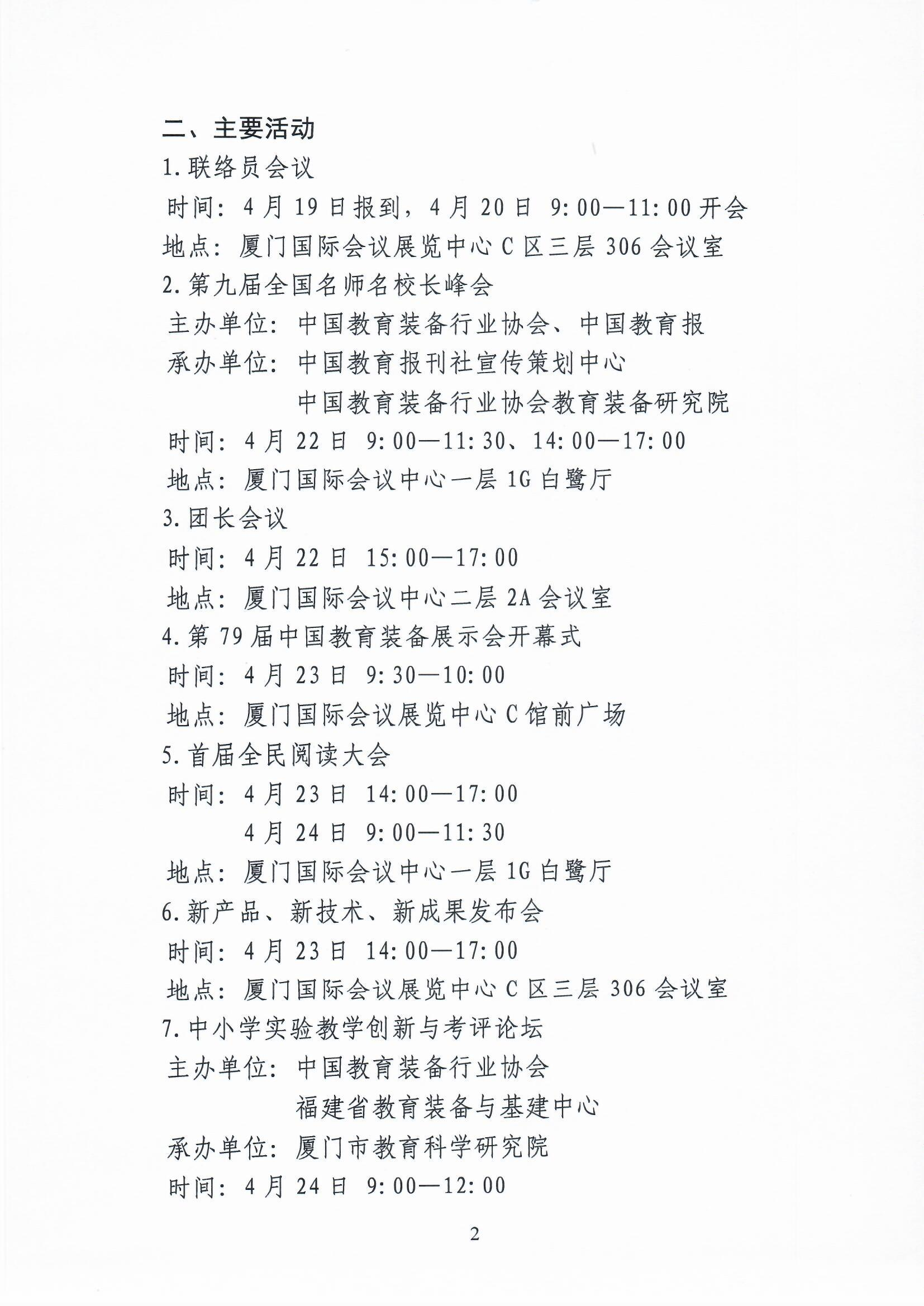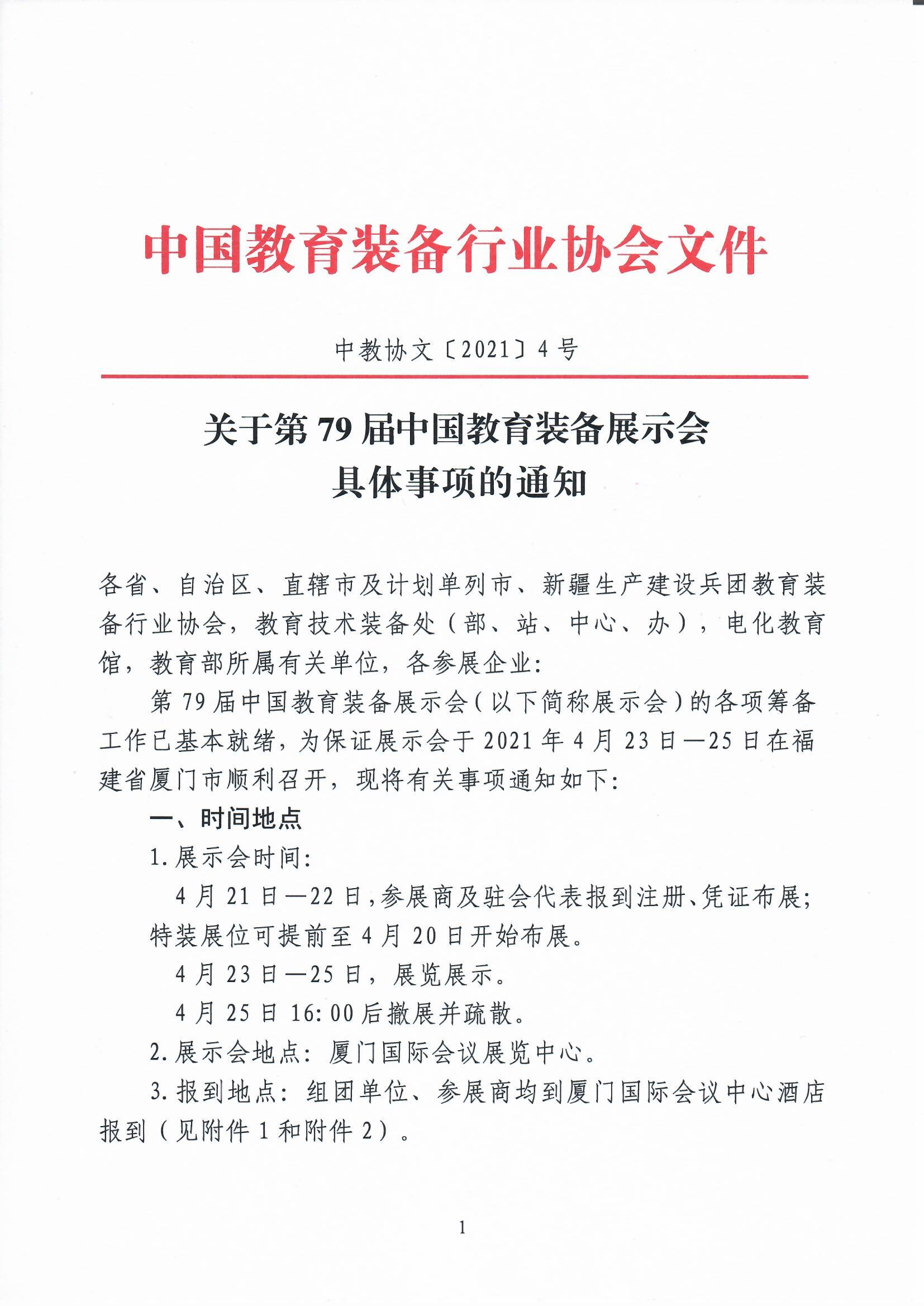 第79屆中國教育裝備展示會(以下簡稱展示會)的各項(xiàng)籌備工作已基本就緒,為保證展示會于2021年4月23日—25日在福建省廈門市順利召開,現(xiàn)將有關(guān)事項(xiàng)通知如下: