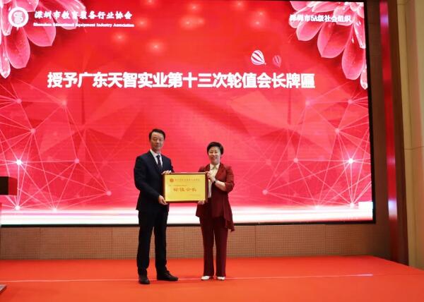 會上,深圳市教育裝備行業(yè)協(xié)會會長彭錦環(huán)為天智董事長李美英女士授予輪值會長,并頒發(fā)榮譽牌匾。