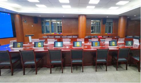 按照會議室布局,配置了16點位的無紙化升降一體終端,以嵌入式方式安裝在會議桌面,令會議室整體整潔、美觀。系統平臺采用的是JUSBE自主研發并擁有著作權的軟件系統,集合了豐富強大的會議服務功能,只需觸控屏幕即可快速幫助參會者輕松掌握會議信息,高效完成會議內容。