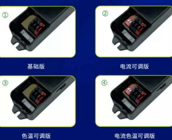 多功能版本可選:①常規版;②電流可調版(電源撥碼或引線到燈具外部調電流可選);③色溫可調版(電源撥碼);④電流色溫可調版(電源撥碼)